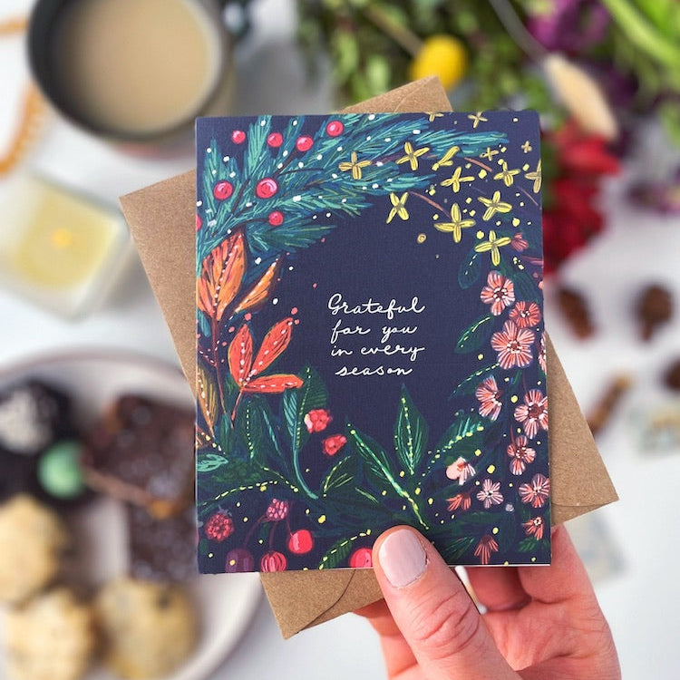 In the middle of the wreath are the words "Grateful for you in every season."